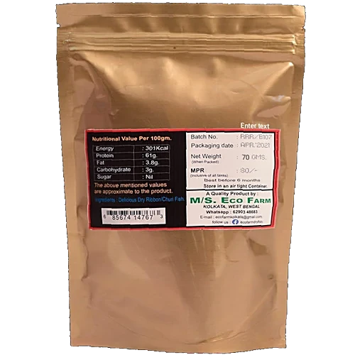 Ecofarm Dry Ribbon Fish also know as the Churi Fish. It is dried in the sun to prevent its soft flesh from spoiling. It is one of the oldest ways of preserving fish that is still considered one. It has a slim, ribbon-like appearance. This fish provides us with omega-3 fatty acids, Vitamin D, an excellent source of calcium, and proper food metabolism. It is mild with a hint of briny, ocean flavour with a delicate, white texture. It can be used in many curries, roasted or fried. It is free from harmful preservatives. Dry ribbon fish retains the antioxidant.